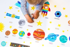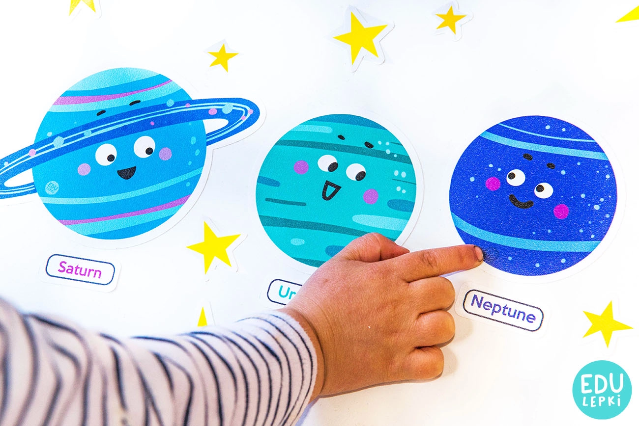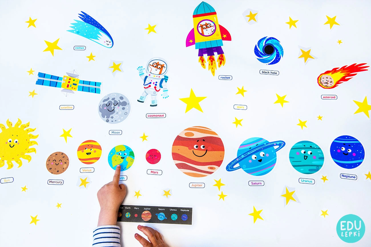 - Dziecko uczy się nazw planet oraz ich kolejności w układzie słonecznym, a także terminów różnych obiektów kosmicznych w języku polskim