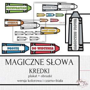 Magiczne słowa - kredki - kolorowe i czarno białe. Zawiera słowa: dzień dobry, do widzenia, przepraszam, dziękuję, proszę.