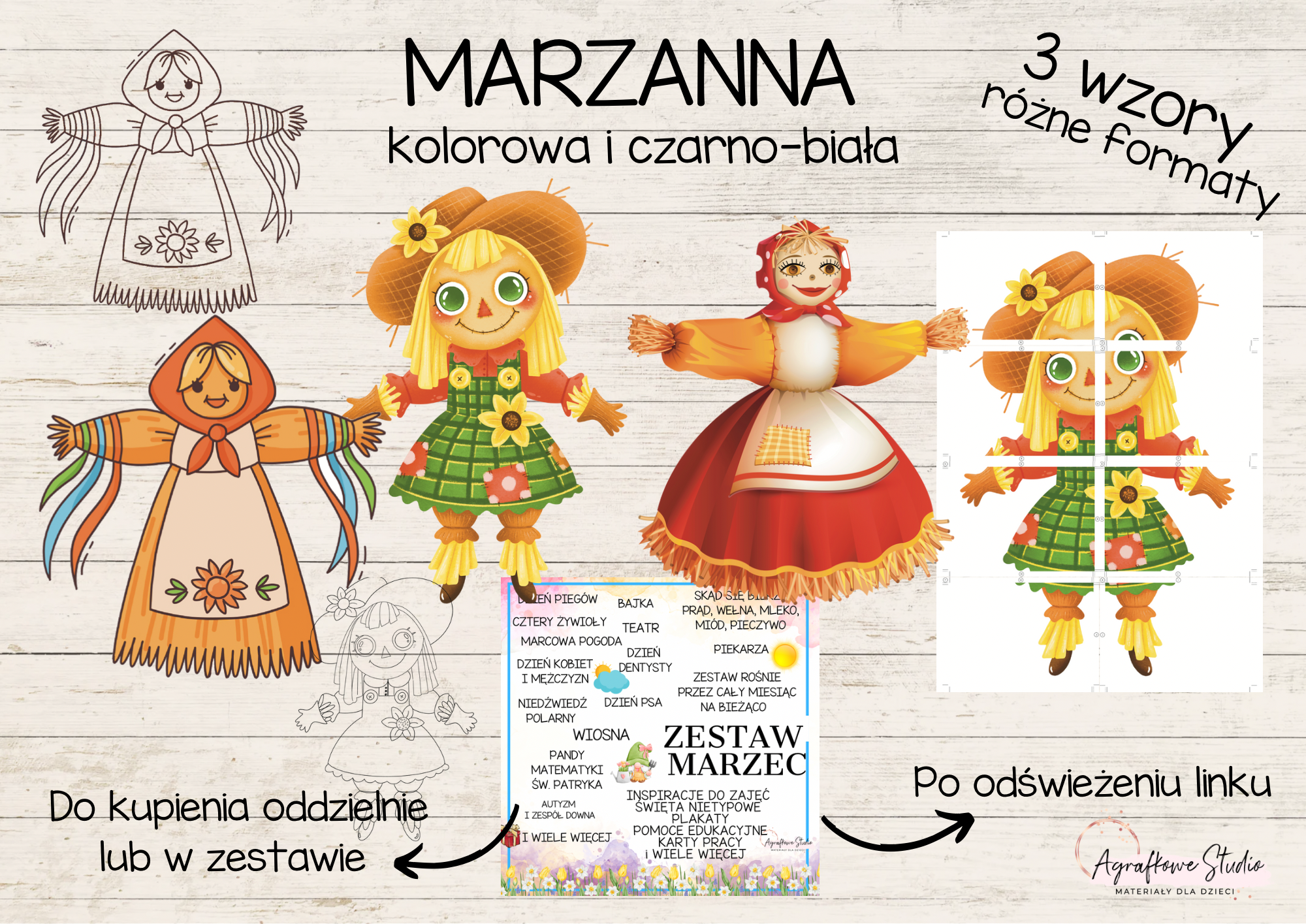 Zawiera 3 wzory Marzanny kolorowe, czarno białe oraz w różnym formacie